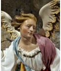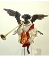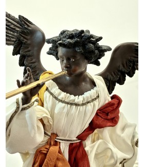 Testa, mani e piedi in te.rracotta Policroma. Corpo in fil di ferro e stoppa. Ali in legno. Occhi di vetro. Abito in seta. Tromba in ottone